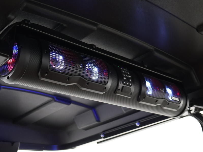 Immersive Audio: Includes a 28-inch SoundExtreme Elite soundbar by ECOXGEAR, delivering high-fidelity sound with customizable RGB LED lighting that can be controlled via the touchscreen.
