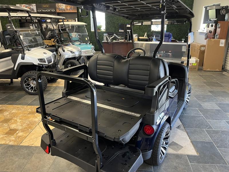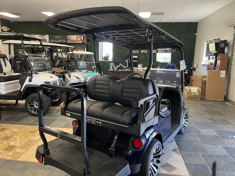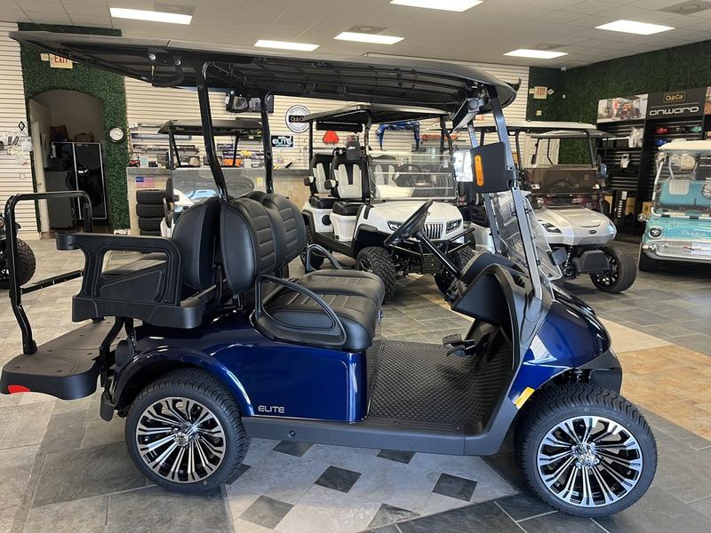 The 2024 E-Z-GO Freedom RXV ELiTE Lithium in Patriot Blue offers zero-maintenance Lithium power (4.2 Twin Pack), IntelliBrake™ safety technology, and superior design in a 4-passenger configuration.