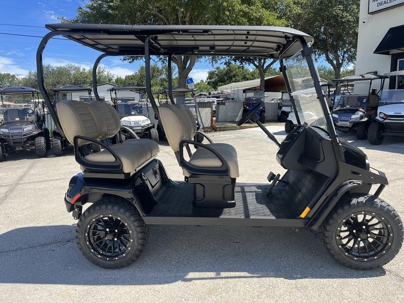 The 2025 E-Z-GO Liberty ELiTE Lithium in Black features four forward-facing seats, zero-maintenance Lithium power, IntelliBrake™ safety, and premium lighted cupholders.